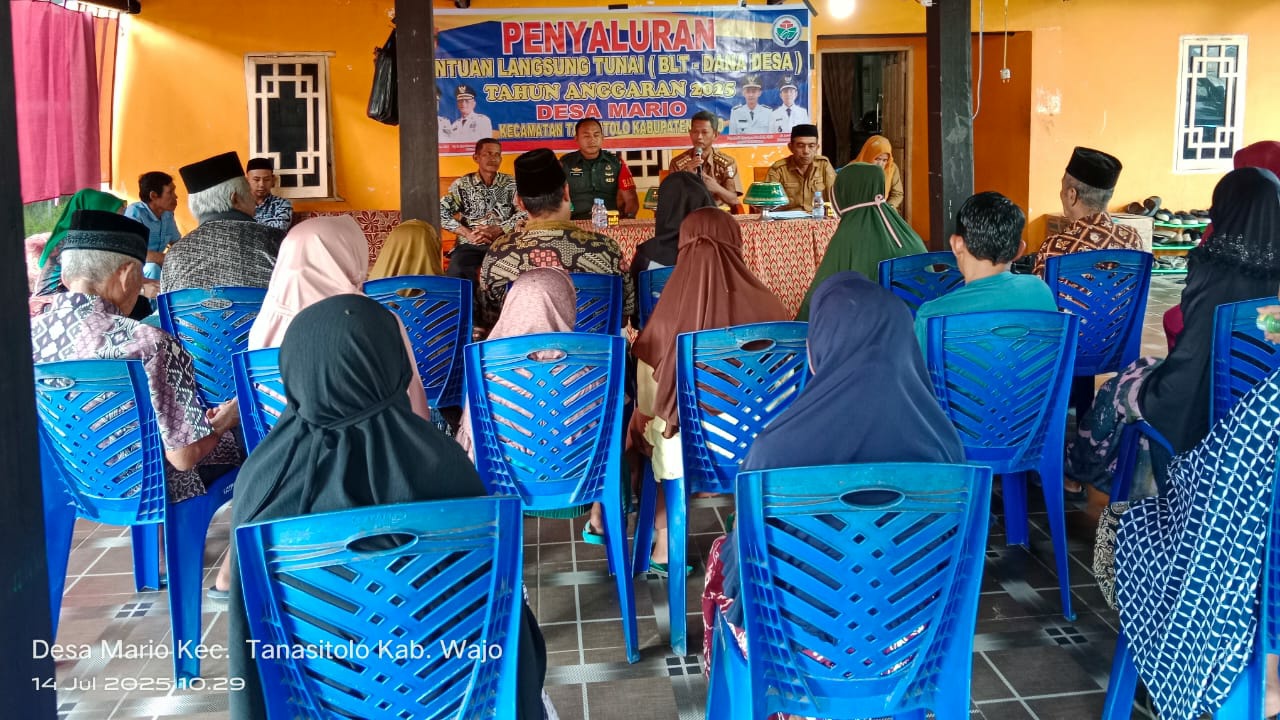 Kepala Desa Mario, H. La Tejjo, S.E., yang menjelaskan bahwa penyaluran BLT merupakan hasil dari verifikasi dan validasi data keluarga penerima manfaat yang telah dilakukan secara transparan dan akuntabel.