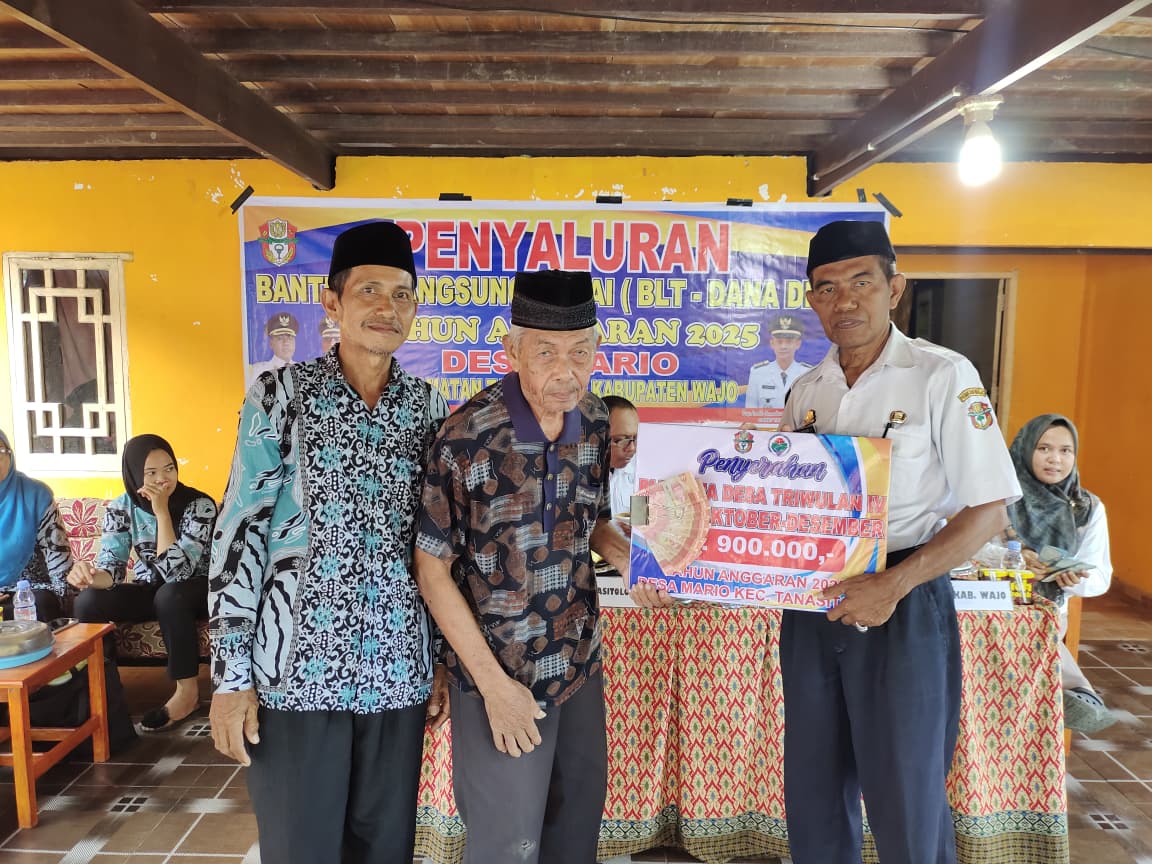 MARIO - pada (08/10/2025) Pemerintah Desa Mario, Kecamatan Tanasitolo, Kabupaten Wajo melaksanakan penyaluran Bantuan Langsung Tunai (BLT) Dana Desa Triwulan IV Tahun 2025, yang meliputi bulan Oktober, November, dan Desember, bertempat di Balai Desa Mario, Selasa (tanggal kegiatan).