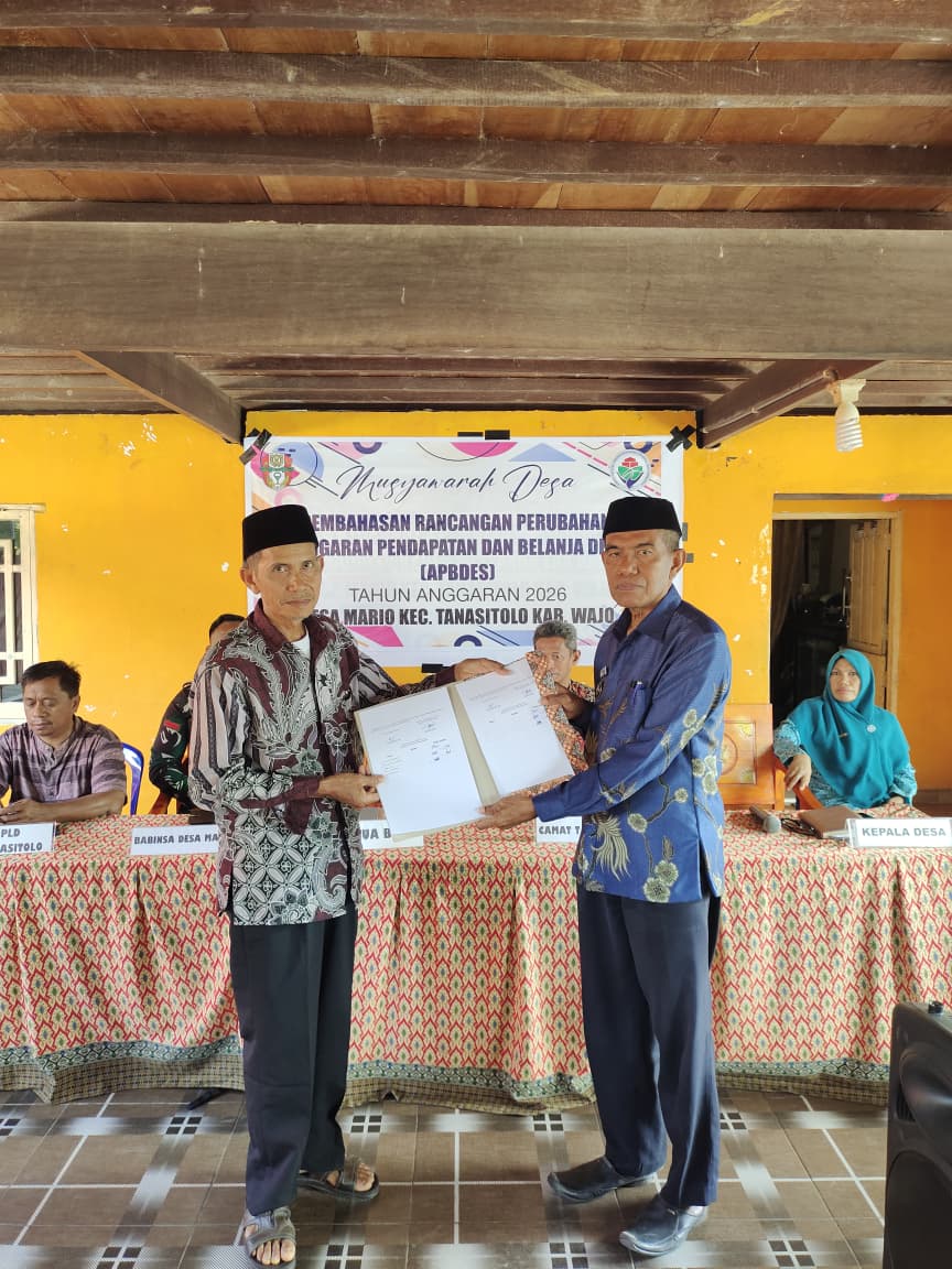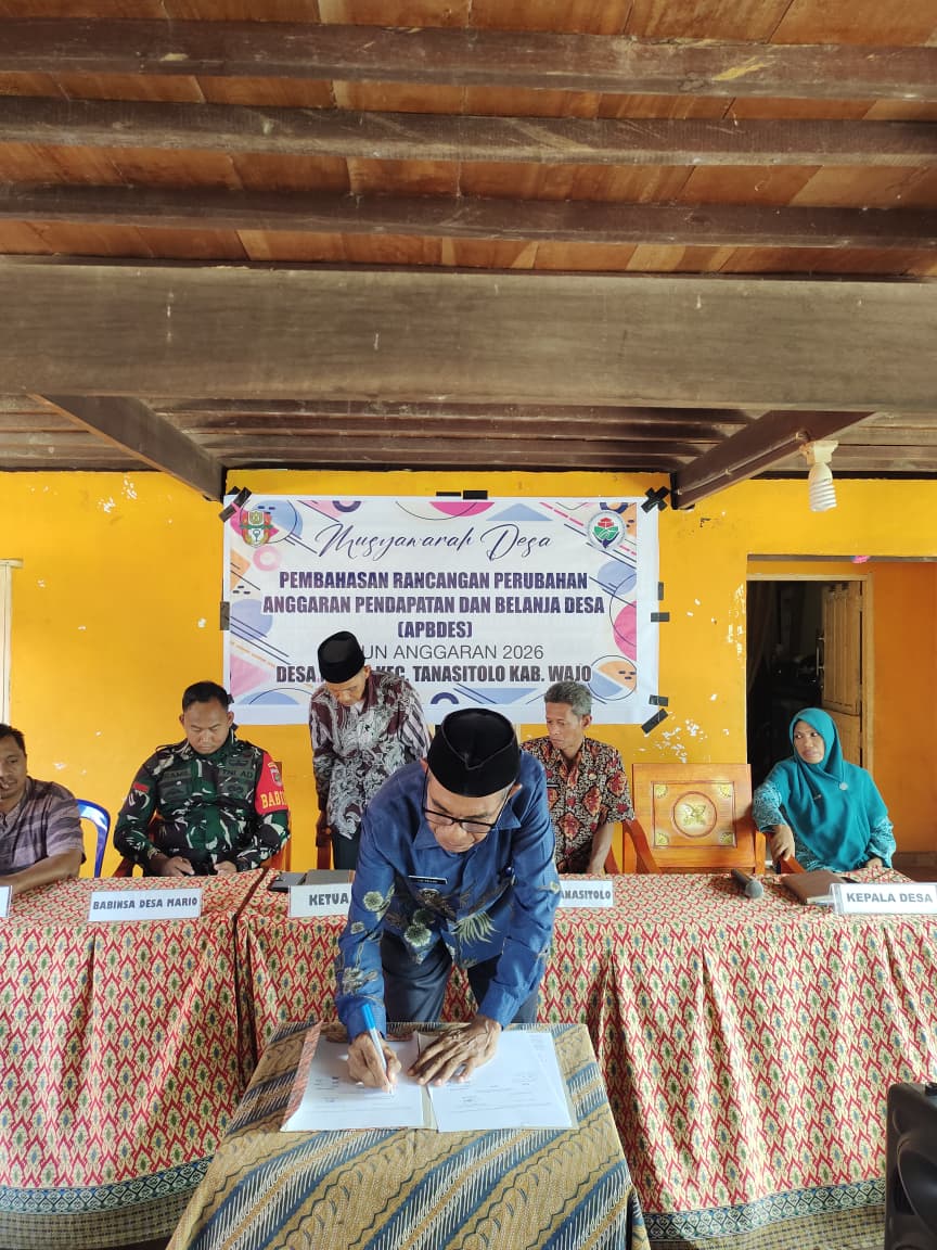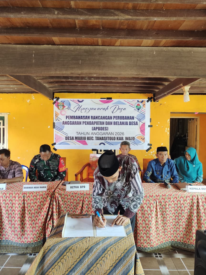 MARIO- pada (26/02/2026) Badan Permusyawaratan Desa (BPD) Desa Mario menggelar Musyawarah Desa dalam rangka pembahasan Rencana Perubahan Anggaran Pendapatan dan Belanja Desa (APBDes) Tahun Anggaran 2026 yang dilaksanakan di Balai Desa Mario. Kegiatan ini berlangsung dengan penuh khidmat dan partisipatif, melibatkan berbagai unsur pemerintahan dan masyarakat desa.