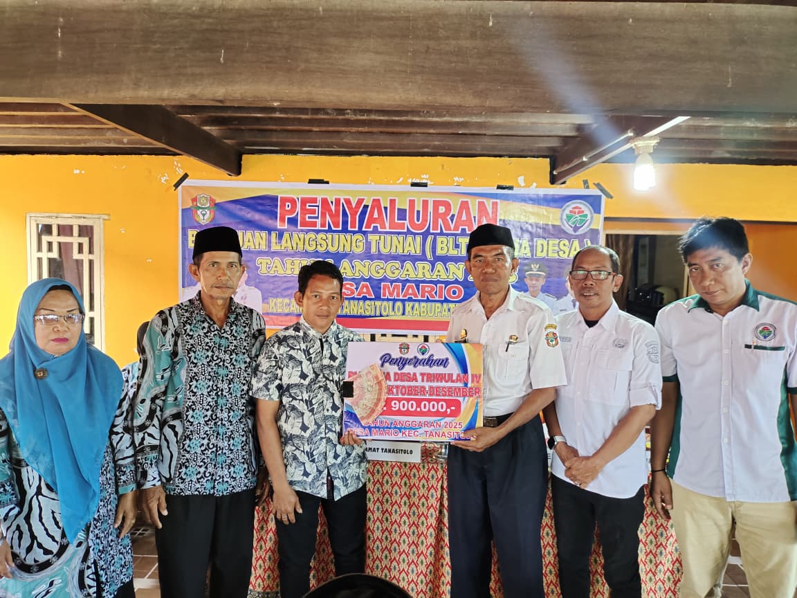 MARIO - pada ( 02/09/2025) Pemerintah Desa Mario Kecamatan Tanasitolo kembali menyalurkan Bantuan Langsung Tunai Dana Desa (BLT) untuk bulan Agustus dan September 2025. Kegiatan penyaluran berlangsung di kantor desa Mario dan dihadiri langsung oleh Camat Tanasitolo yang diwakili TA P3MD, Kepala Desa